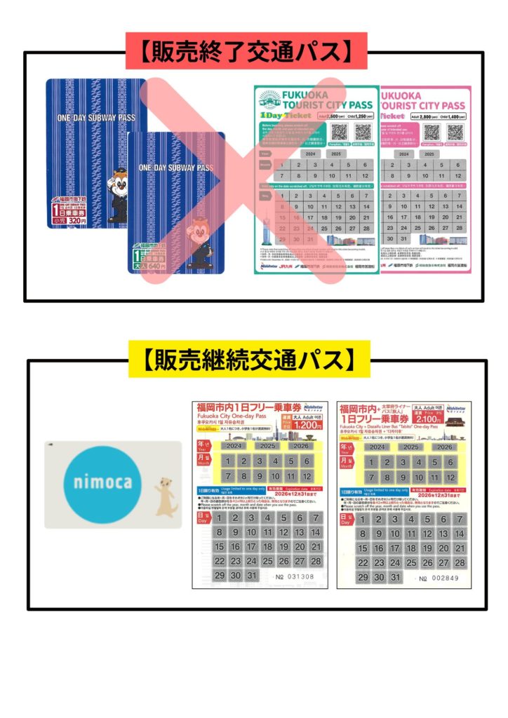 当ターミナル総合案内所における「FUKUOKA TOURIST CITY PASS」・「地下鉄一日乗車券」の取扱いは、2025年12月31日をもって終了いたします。交通パスをご購入の際はご注意ください。
