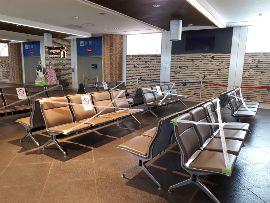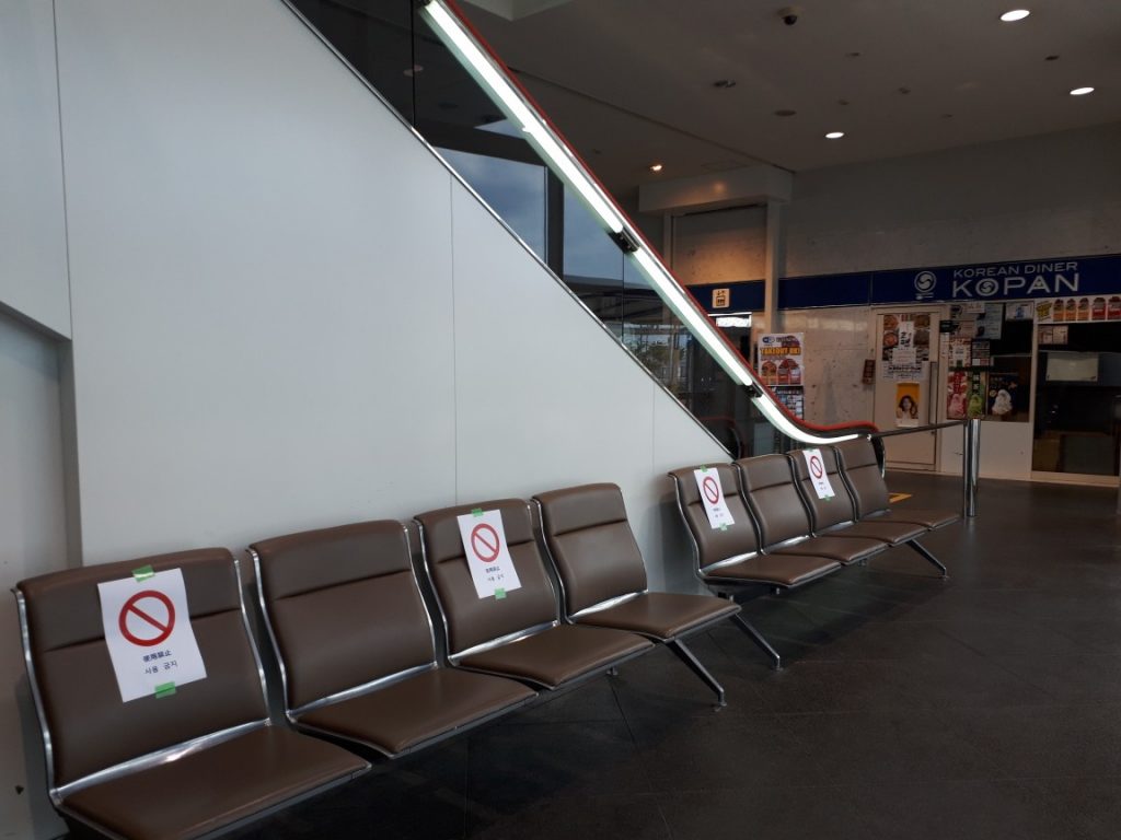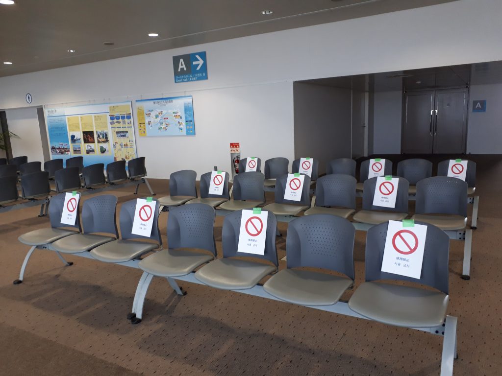 博多港国際ターミナルでは、新型コロナウイルス感染拡大防止のため、「ソーシャルディスタンスにご協力ください」を掲げて皆さまにご協力をお願いしています。