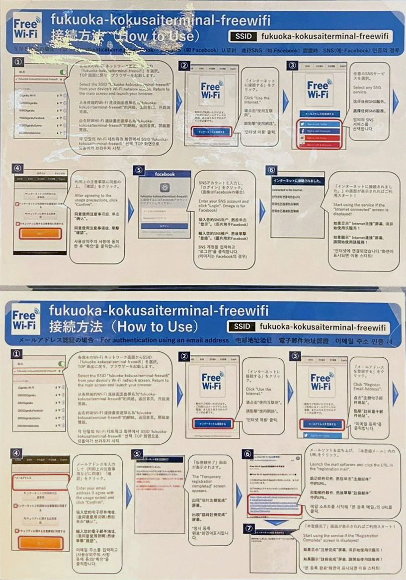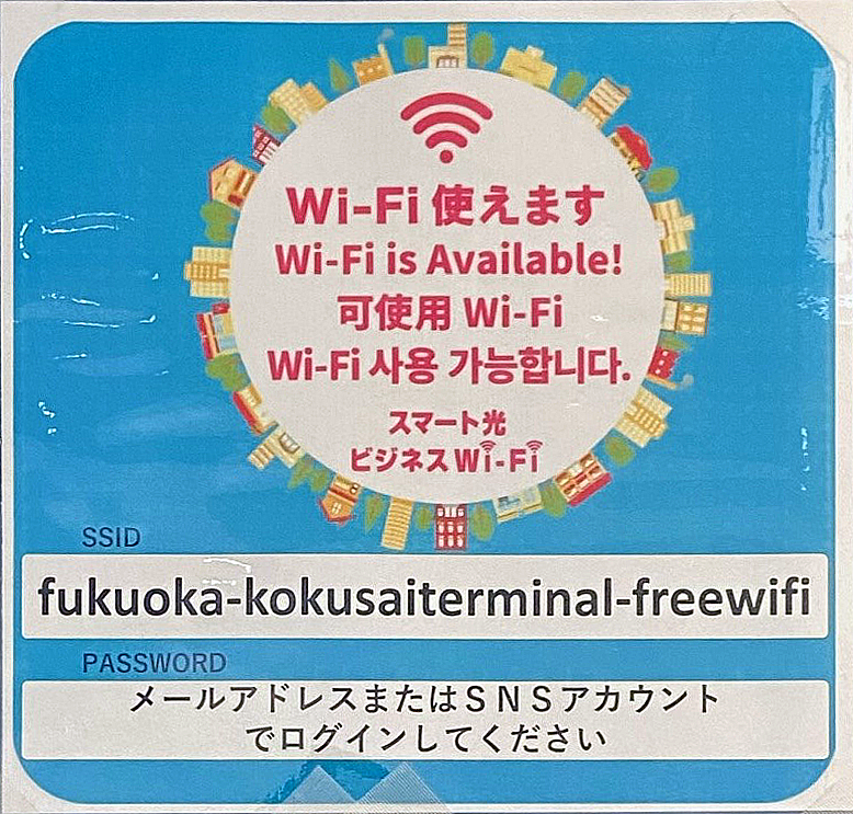 하카타항 국제 터미널에서 이용하실 수 있는 와이파이가 추가되었습니다. 1층에서 3층의 공용 공간에서 사용이 가능합니다. 또한 이용에 대해서는 메일주소 또는 SNS계정으로 로그인할 필요가 있습니다. 관내에 접속 방법에 대한 안내를 개시하고 있으니 확인해 주십시오. 이용 횟수는 1일 2회 (회당 2시간) 입니다. 또한 홀, 회의실에는 전용 와이파이도 준비되어 있으니 이용해 주십시오. 기존의 Wi-Fi(FUKUOKA CITY WI-FI)도 계속해서 이용하실 수 있으니 많은 이용 부탁드립니다.